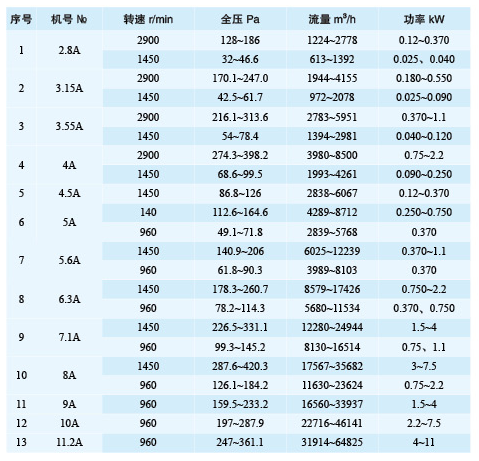 本系列產品均采用葉輪直接裝在電動機軸上的直聯結構。在葉輪圓周速度不超過60m /S條件下配用三種轉速:2900、1450、 960 r /min面對進風口方向看葉輪為逆時針轉動,進氣方向在葉輪端。